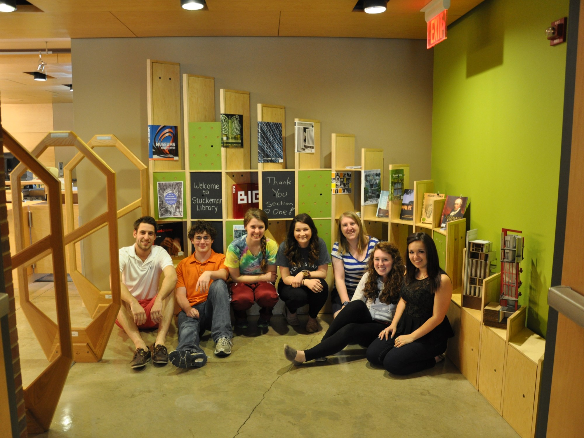 In addition to creating a more pleasant entry-way, the shelving system provided a small amount of secure storage, chalkboard and pin-up space for announcements, shelving for model displays, and ample room for book jackets to be displayed on the vertical slats.