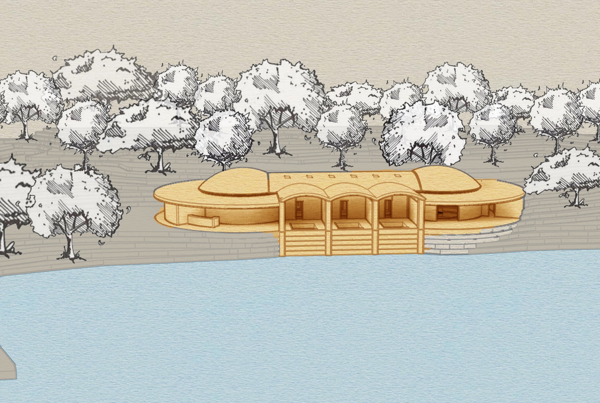 Hydrotherapy Center built on Bald Eagle Lake. This design is comprised of three sections: the traditional roman bath progression, physical therapy pools, and personal relaxation grottos.